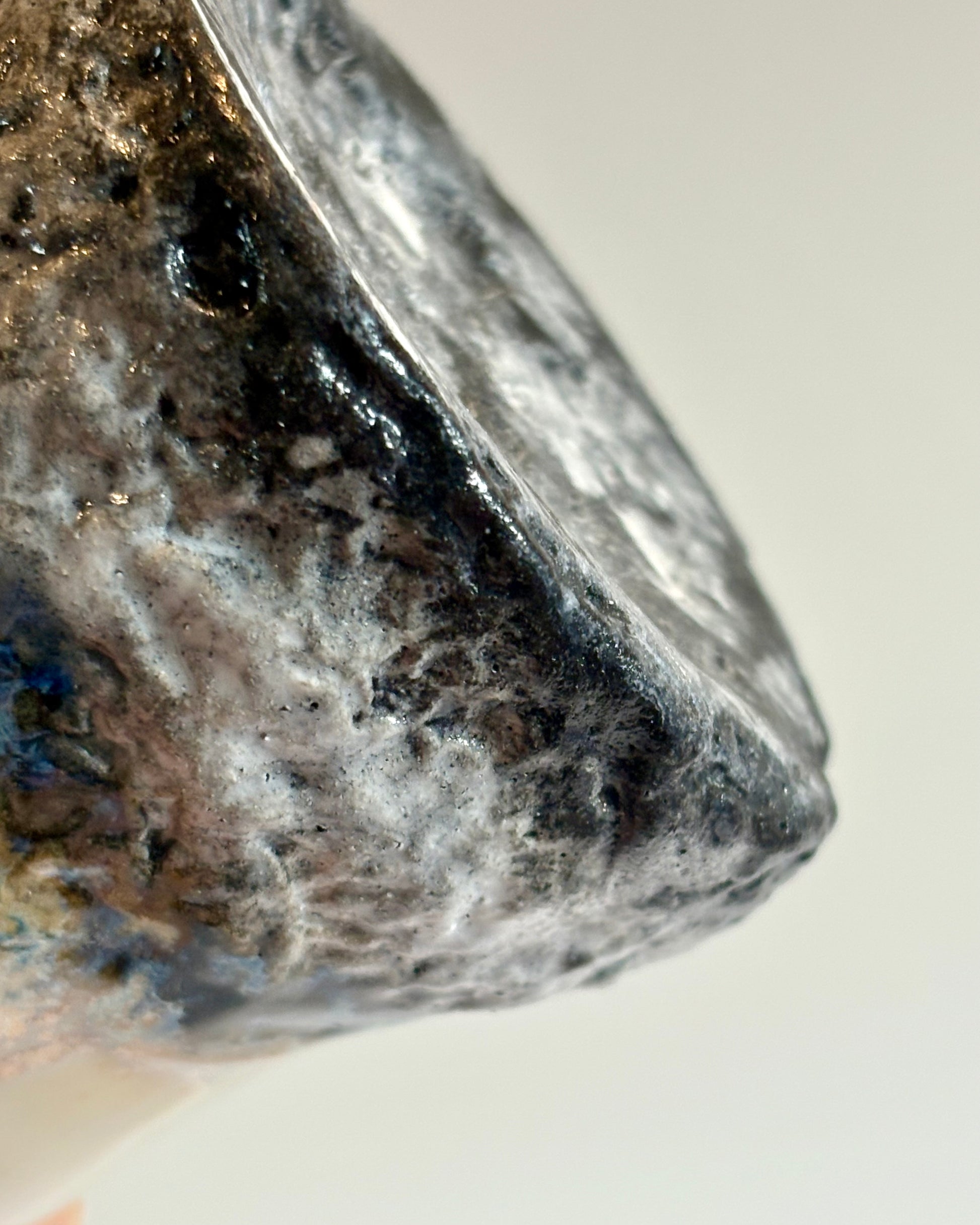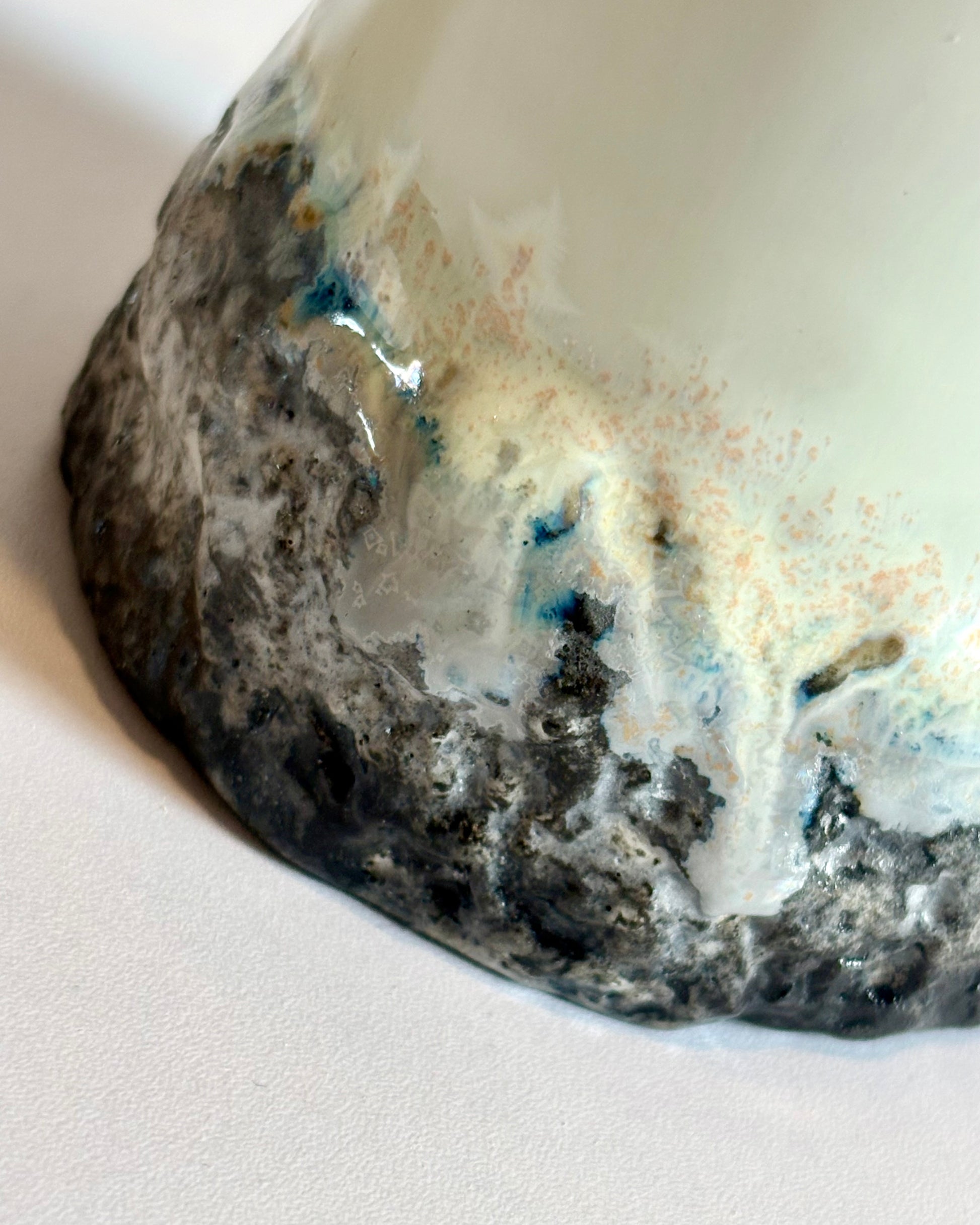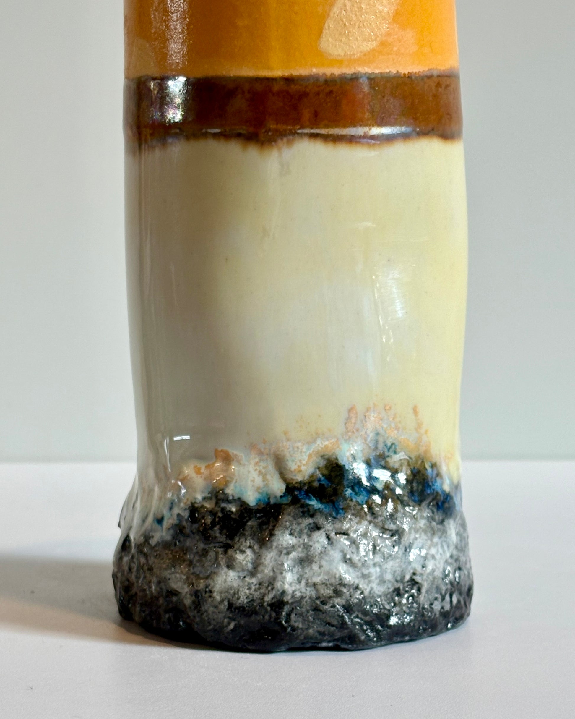 Made from midfire clay and features crystalline glazes in the paper and band.