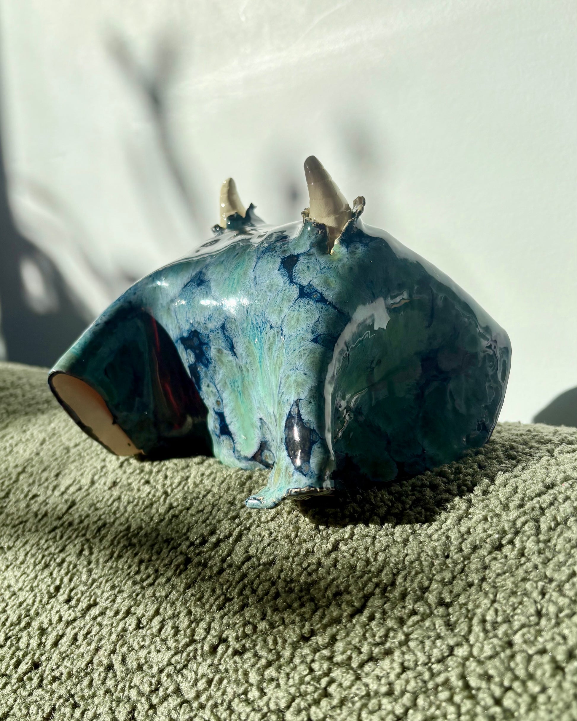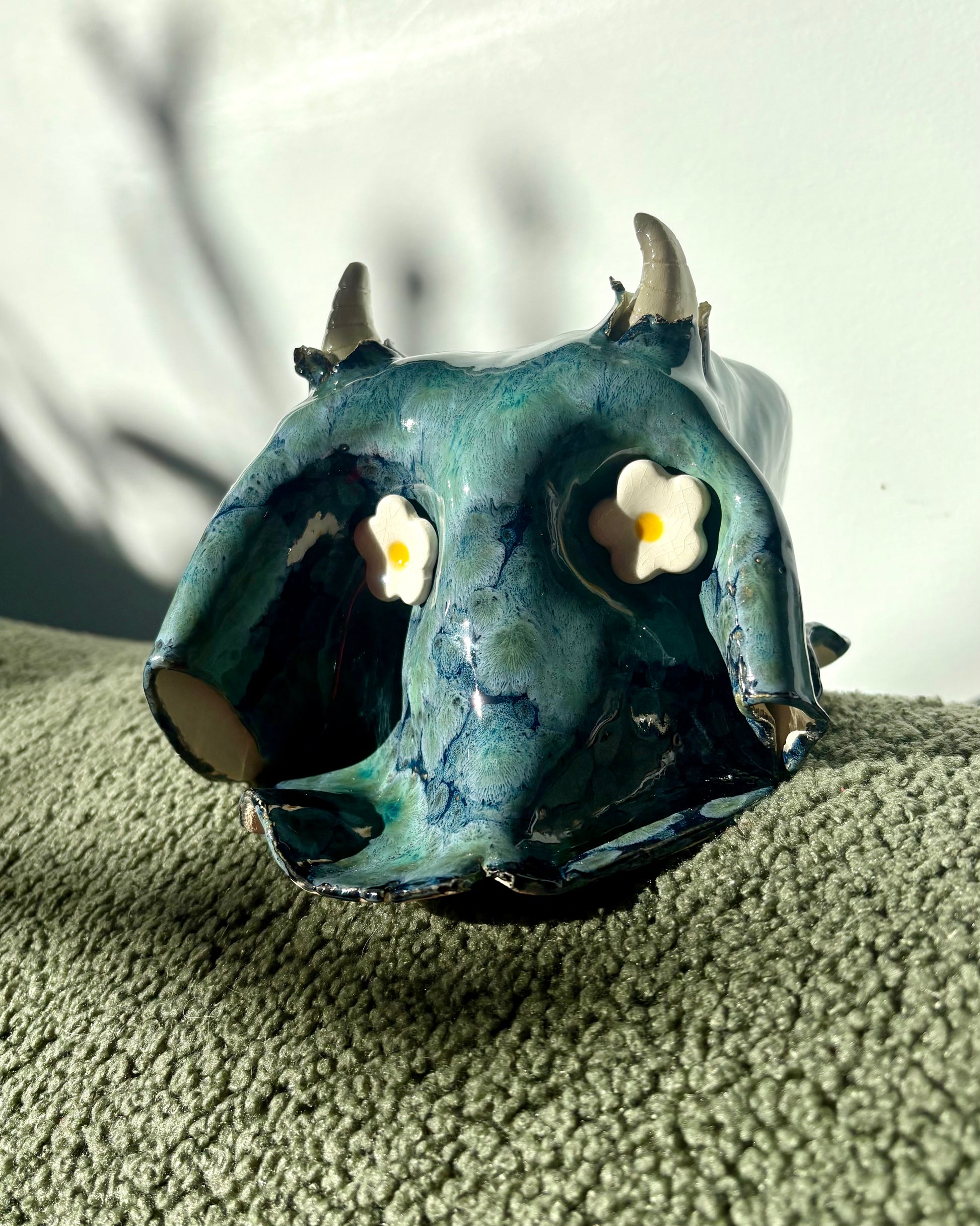 This Yokai covers his face with sheets. Ceramic sculpture with removable magnetic blossom eyes.