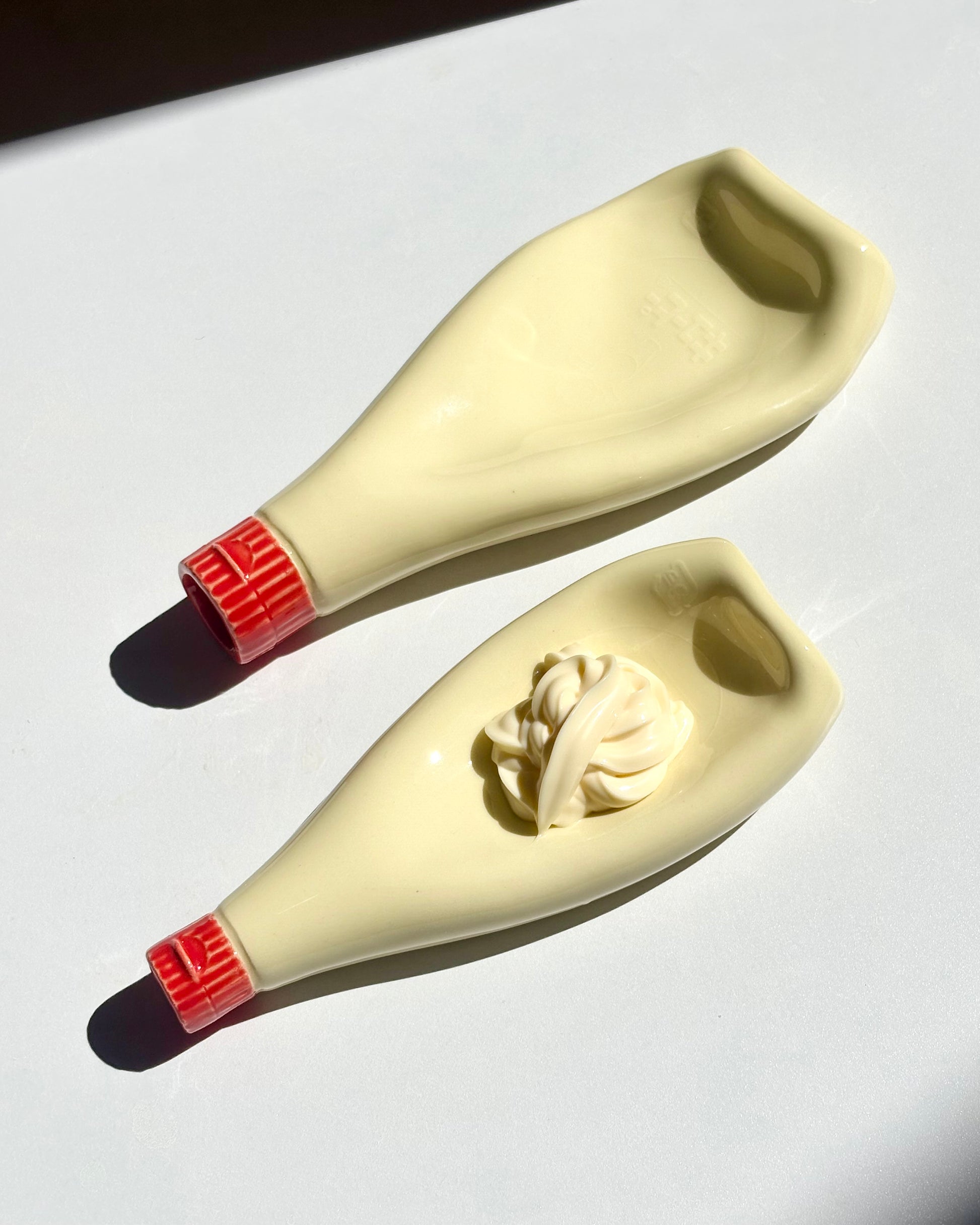 Use as a spoon rest, trinket tray or dip dish. All bottles are hand squished and will vary in shape. Slipcast from a 300g Kewpie Japanese Mayonnaise bottle, this vase is 80% of the actual size. This dish is food safe but is best washed by hand.